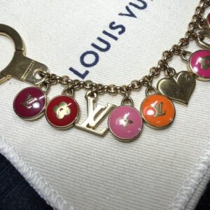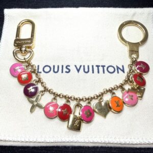 - デザイン: ゴールドカラーのチェーンに、モノグラム・フラワーやLVロゴのチャームがマルチカラーで配置されています。